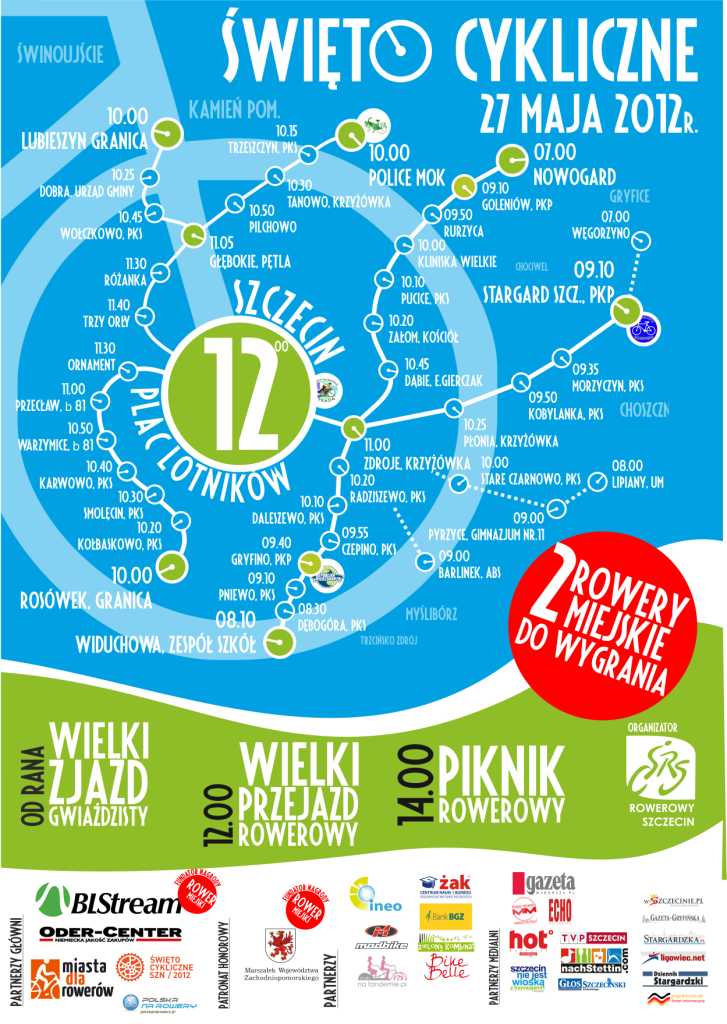 Następnie o godzinie 12:00 Marszałek Województwa Zachodniopomorskiego powita rowerzystów zebranych na pl. Lotników po czym wszyscy wyruszą na Wielki Przejazd Rowerowy ulicami Szczecina. Na pl. Lotników będzie można zgłaszać się do konkursu na najciekawsze nakrycie głowy (http://www.rowerowy.szczecin.pl/index.php?option=com_content&view=article&id=1635:konkurs-na-najbardziej-pomysowe-eleganckie-nakrycie-gowy&catid=164:wito-cykliczne-2012&Itemid=447 ) oraz odbędzie się „Akcja Nakrętka” (http://www.rowerowy.szczecin.pl/index.php?option=com_content&view=article&id=1636:akcja-nakrtka-wielka-zbiorka-dla-adriana&catid=164:wito-cykliczne-2012&Itemid=447 ), podczas której zbierane będą plastikowe nakrętki dla Adriana, a dla trzech osób które przywiozą ich ze sobą najwięcej, czekają bony do Oder Center. Podczas przejazdu na Trasie Zamkowej zostanie wykonane przez Cezarego Skórkę pamiątkowe zdjęcie wszystkich uczestników przejazdu. Przejazd będzie odbywał się w bardzo wolnym tempie, więc mogą wziąć w nim udział całe rodziny.