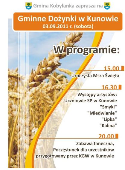 Wójt Gminy Kobylanka, sołtys wsi Kunowo oraz Starostowie Dożynek 2011, mają zaszczyt serdecznie zaprosić na gminne uroczystości dożynkowe organizowane w Kunowie 3 września 2011 r