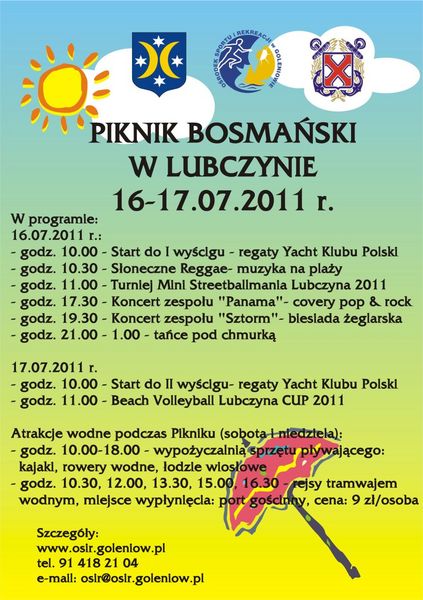 Ośrodek Sportu i Rekreacji w Goleniowie zaprasza wszystkich na Pikinik Bosmański w Lubczynie 16 i 17 lipca 2011 r.