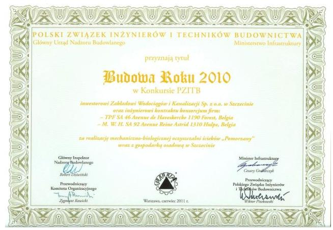 Nagrodę I stopnia w kategorii obiektów inżynieryjnych i prestiżowy tytuł „Budowa Roku 2010” otrzymała mechaniczno-biologiczna oczyszczalnia ścieków „Pomorzany” w Szczecinie. Wyróżnienie to podczas uroczystej gali finalistów konkursu, która odbyła się 30.06.2011r. w gmachu Naczelnej Organizacji Technicznej, otrzymał Zakład Wodociągów i Kanalizacji Sp. z o.o. w Szczecinie jako inwestor obiektu wraz z konsorcjum inżyniera kontraktu, firmami TPF S.A. (Belgia) i M.W.H. S.A. (Belgia) „za realizację mechaniczno-biologicznej oczyszczalni ścieków Pomorzany wraz z gospodarką osadową”.