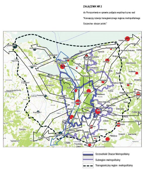 Ponieważ w polskim systemie planowania i zagospodarowania przestrzennego, działania projektowe nie mogą przekraczać granic województwa - w tym przypadku zachodniej granicy państwa - opracowanie dotyczyć będzie części polskiej TRSM. Nie ulega jednak wątpliwości, że rzeczywiste związki przestrzenne Szczecina i zasięg oddziaływania obszaru metropolitalnego wykraczają znacznie w kierunku zachodnim poza obszar województwa