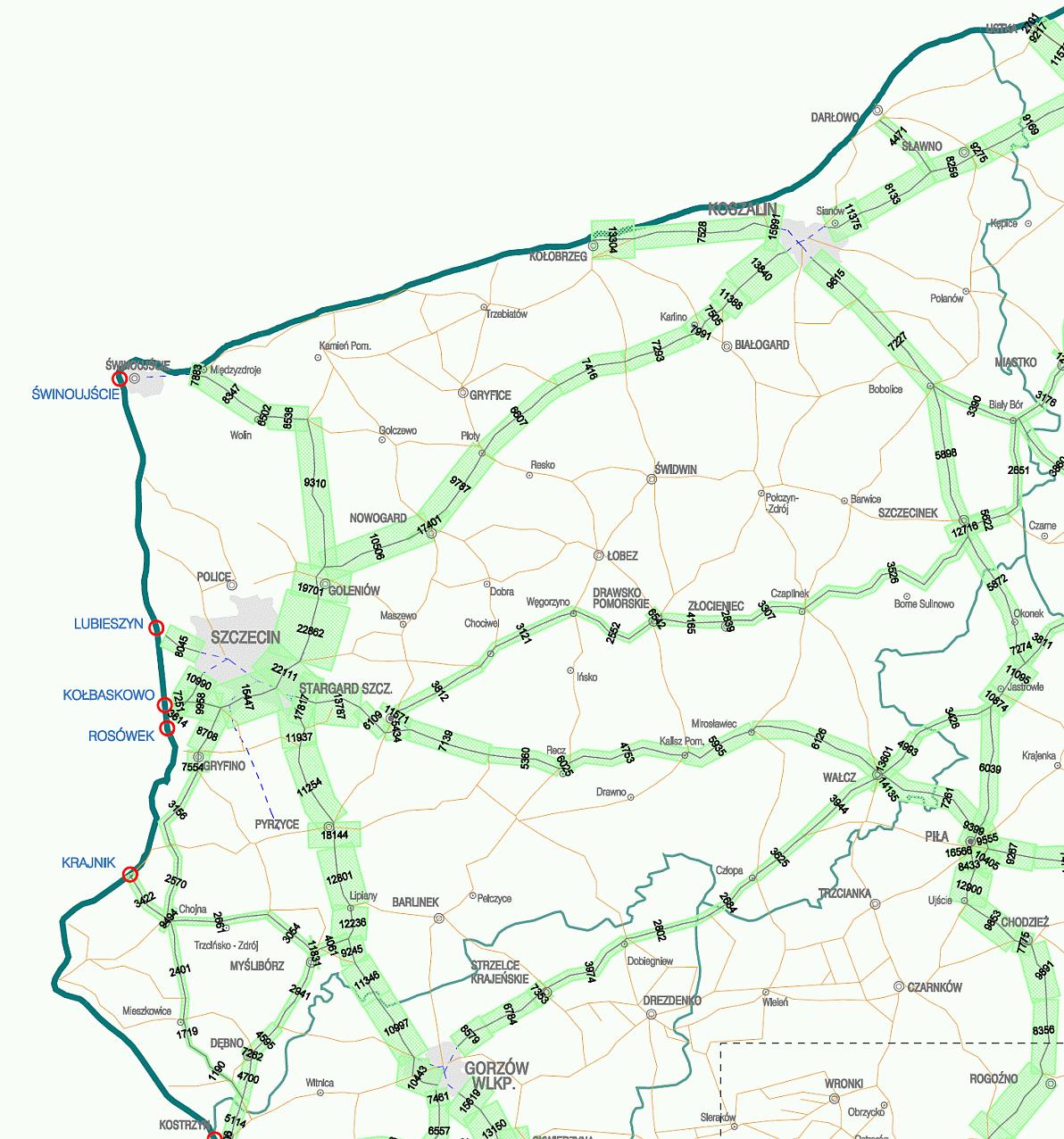 Wykonywane co 5 lat wielkie liczenie pojazdów poruszających się po drogach krajowych wykazało dalszy wzrost ruchu na naszych drogach. W skali całego kraju ruch w stosunku do pomiaru z roku 2005 wzrósł o 22 %, podczas gdy w naszym regionie był to wzrost 15 procentowy. Średni ruch dobowy (SDR) w całym kraju wynosi 9888 pojazdów, natomiast w województwie zachodniopomorskim SDR wynosi 6892 pojazdy.