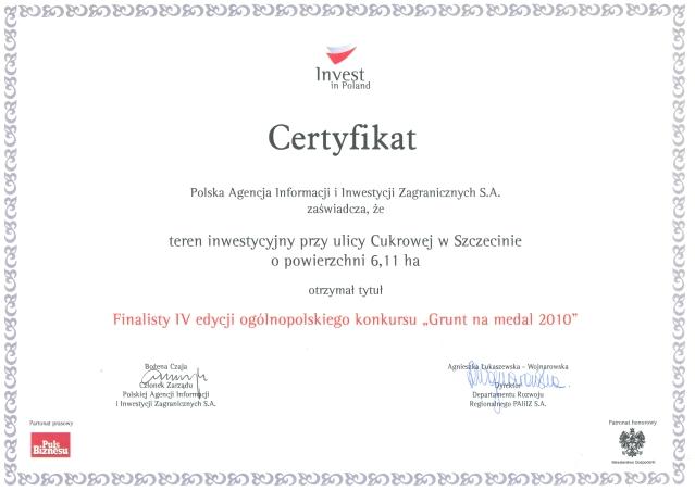 Za dotarcie do finału konkursu Gmina Miasto Szczecin otrzymała okolicznościowy certyfikat potwierdzający atrakcyjność terenu przy ul. Cukrowej. Ponadto teren znajdzie się w bazie terenów inwestycyjnych i Polska Agencja Informacji i Inwestycji Zagranicznych będzie promować go podczas spotkań z potencjalnymi inwestorami.