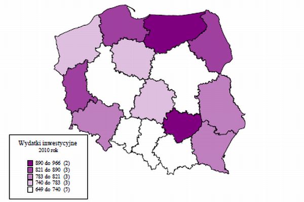 Ponadto w 2010 r. w województwie mazowieckim jako jedynym odnotowano spadek wydatków inwestycyjnych gmin per capita (o 20 zł). Do tej pory gminy tego województwa realizowały najwyższe wydatki inwestycyjne na 1 mieszkańca. Z kolei gminy województwa lubelskiego z ostatniego szesnastego miejsca zajmowanego w latach poprzednich w 2010 r. znalazły się na siódmej pozycji (wzrost o 313 zł).