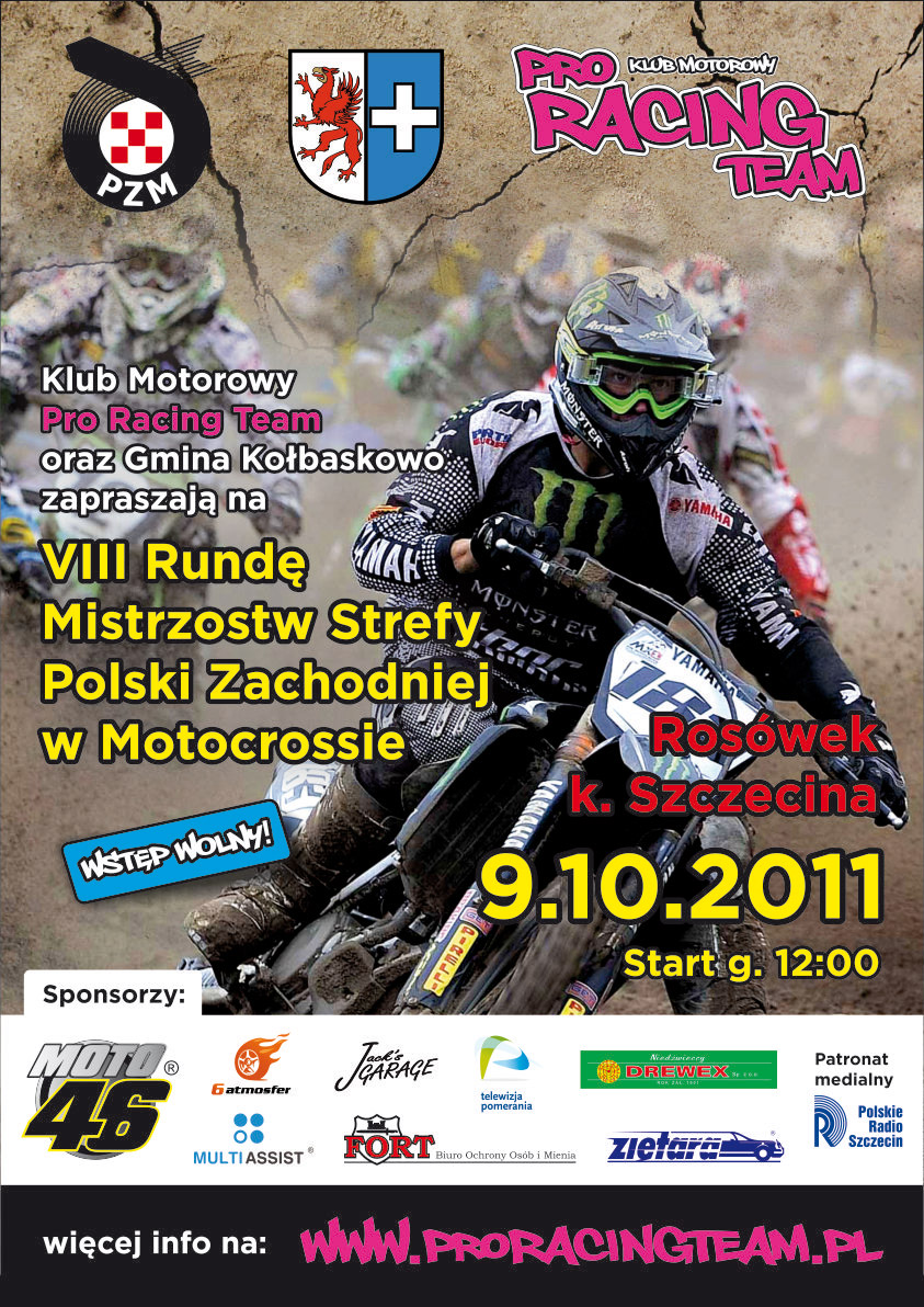 Klub Motorowy Pro Racing Team oraz Wójt Gminy Kołbaskowo zapraszają na VIII Rundę Mistrzostw Strefy Polski Zachodniej w Motocrossie, która odbędzie się 9 października br.