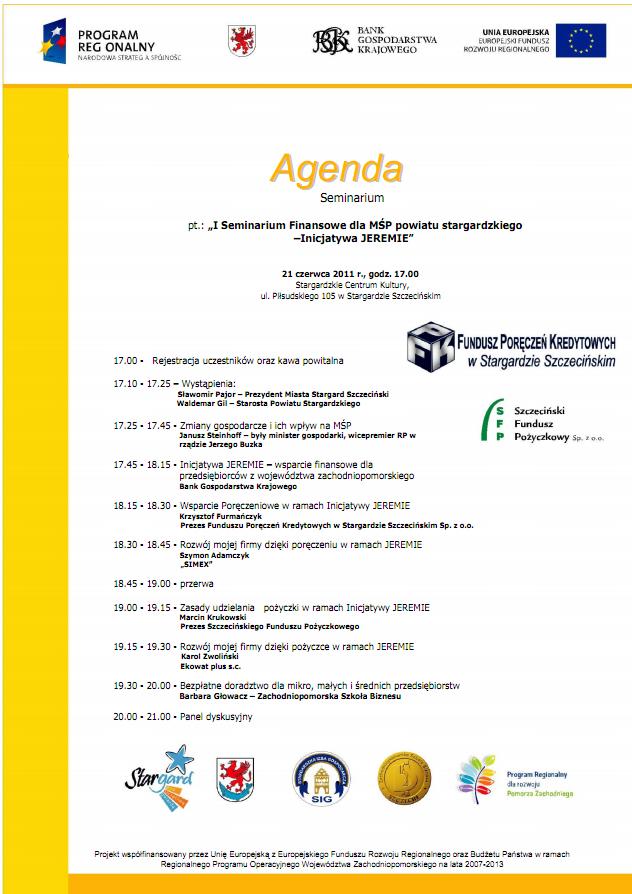 Fundusz Poręczeń Kredytowych w Stargardzie oraz Menadżer Zachodniopomorskiego Funduszu Powierniczego JEREMIE mają zaszczyt zaprosić na seminarium informacyjne pt.: "Inicjatywa JEREMIE - nowe możliwości wsparcia finansowego dla mikro, małych i średnich przedsiębiorstw z województwa zachodniopomorskiego w ramach Zachodniopomorskiego Funduszu Powierniczego JEREMIE”.